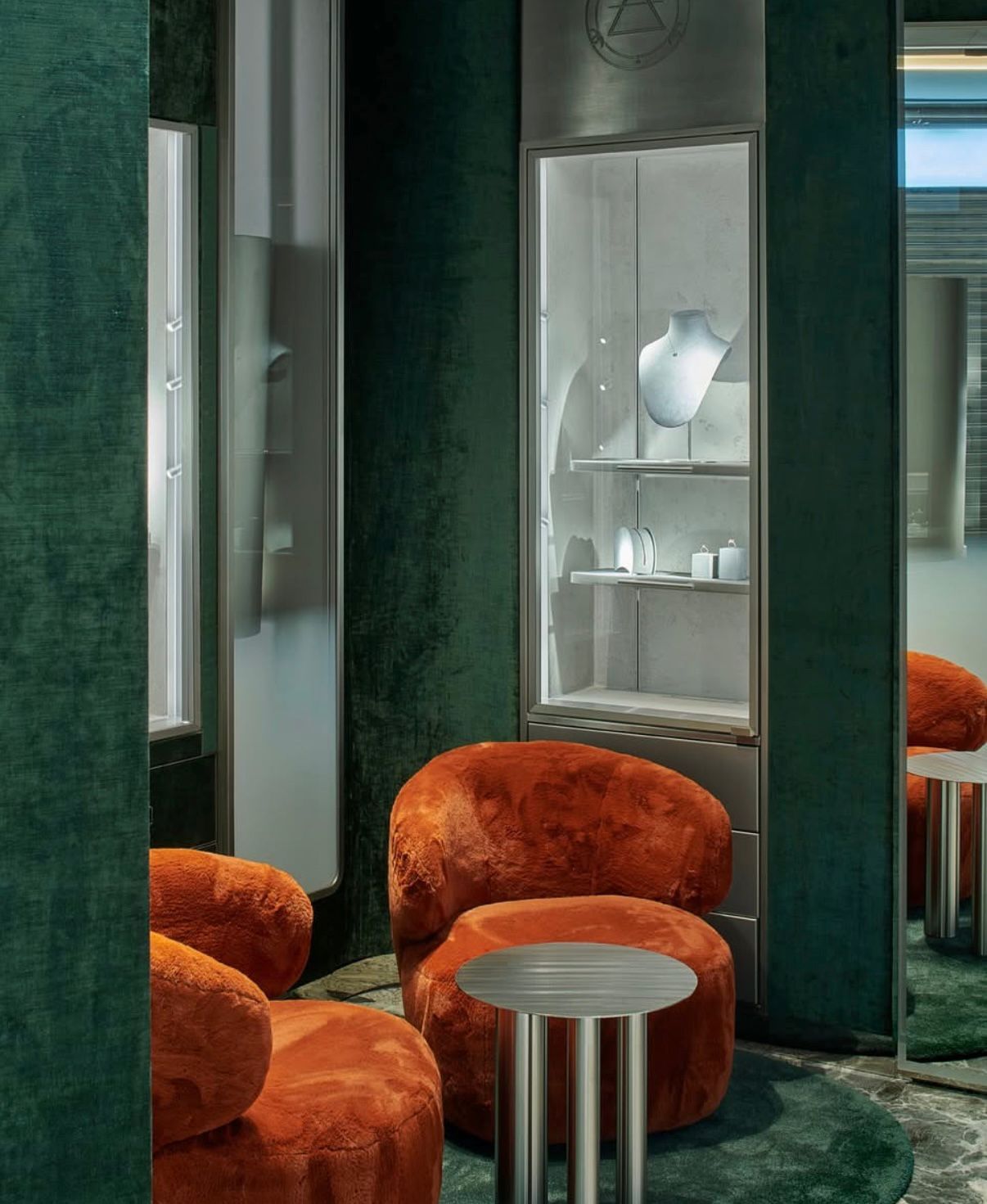 Apvalūs oranžiniai foteliai simbolizuoja komfortą ir saugumą. Jų forma atspindi tą pačią filosofiją kaip ir mūsų vitrinos – nieko aštraus, nieko agresyvaus, tik švelnus, elegantiškas svetingumas.